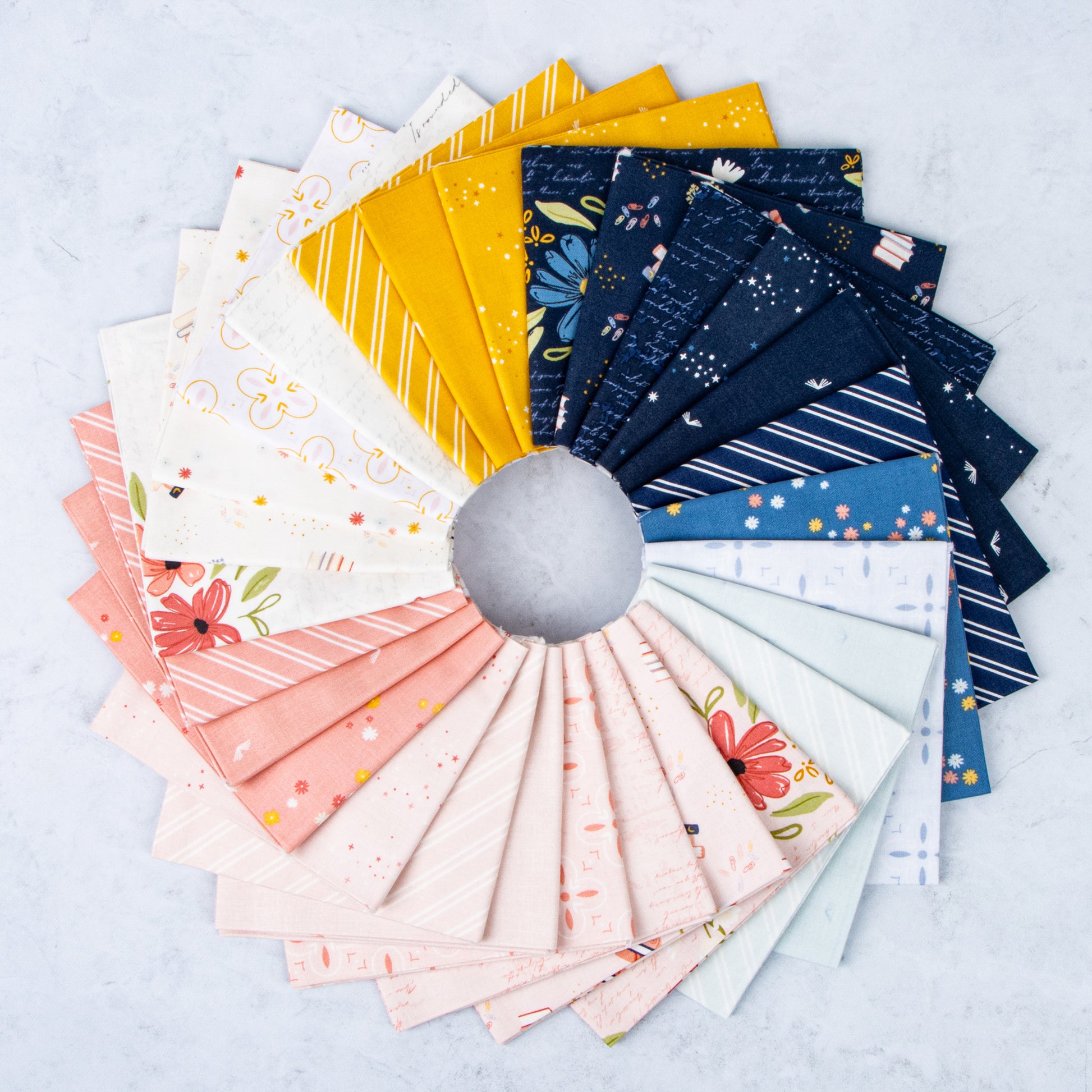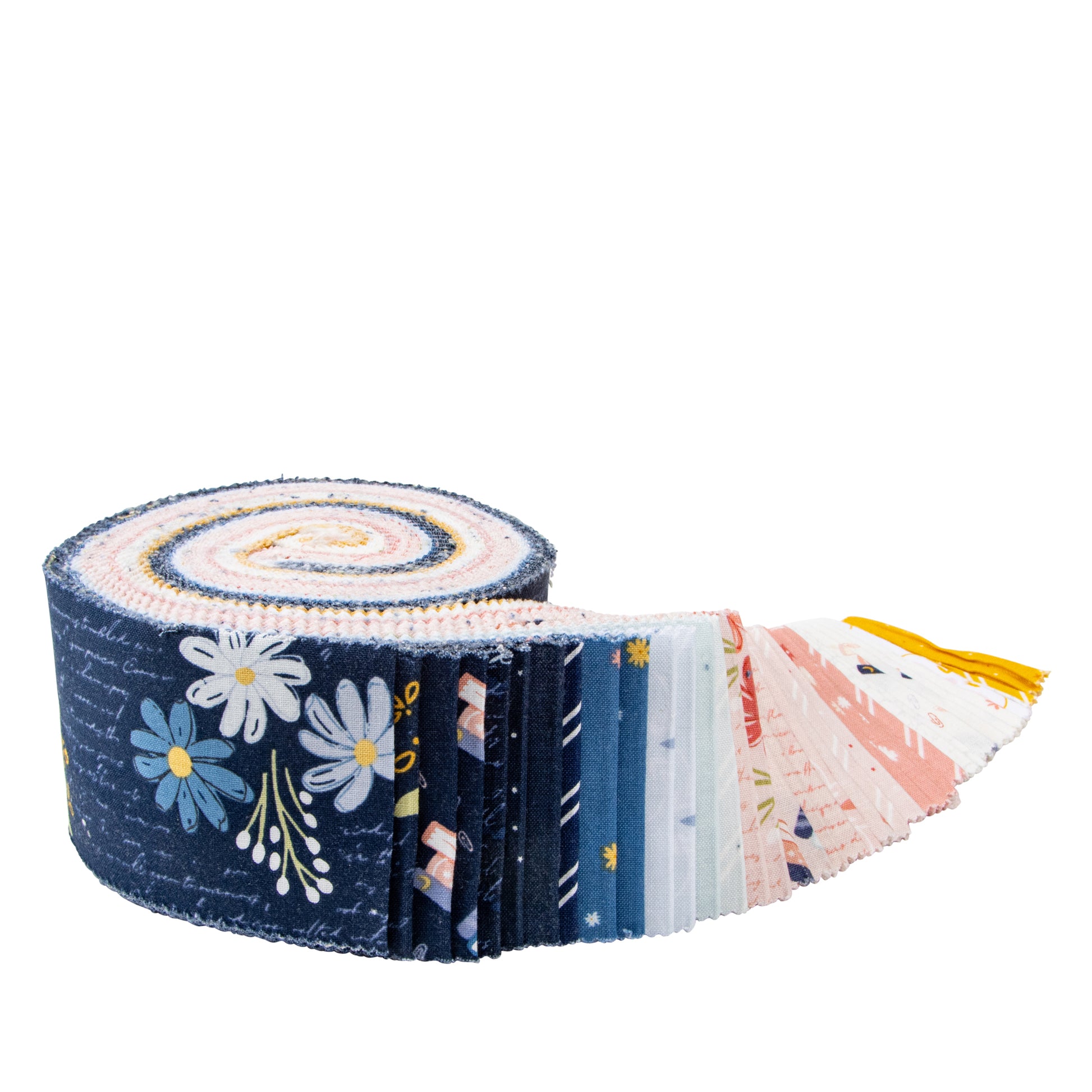 This 2.5 inch rolie polie (jelly roll) includes 40 pieces (28 prints) from the Between the Pages collection by Fran Gulick for Riley Blake. Each print is included 1-2 times. Strips measure approximately 2.5 inches x 44 inches.