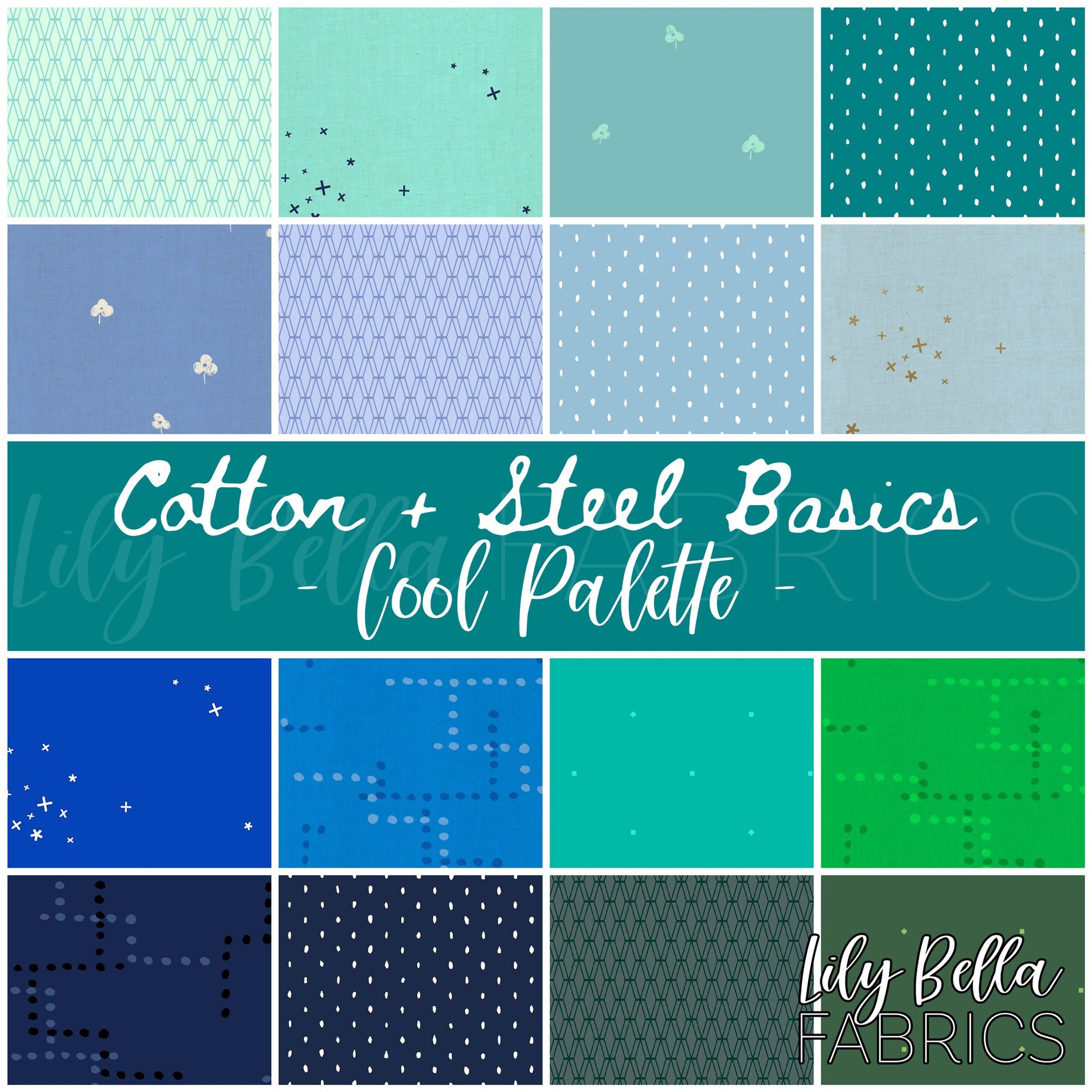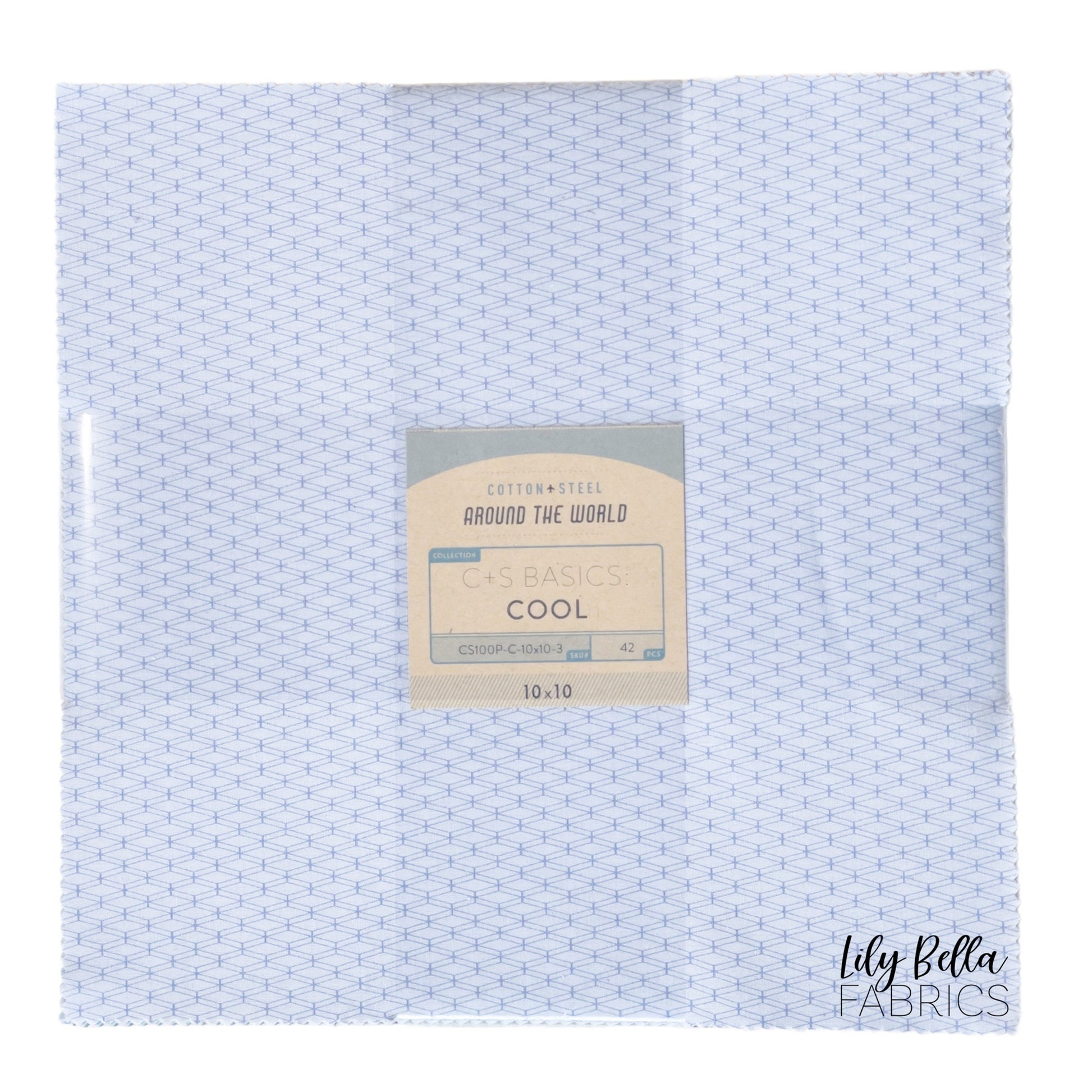 This layer cake includes 42 pieces (15 prints) from the C + S Basics - Cool collection by C + S House Designer for Cotton + Steel. Each print is included 2-3 times.