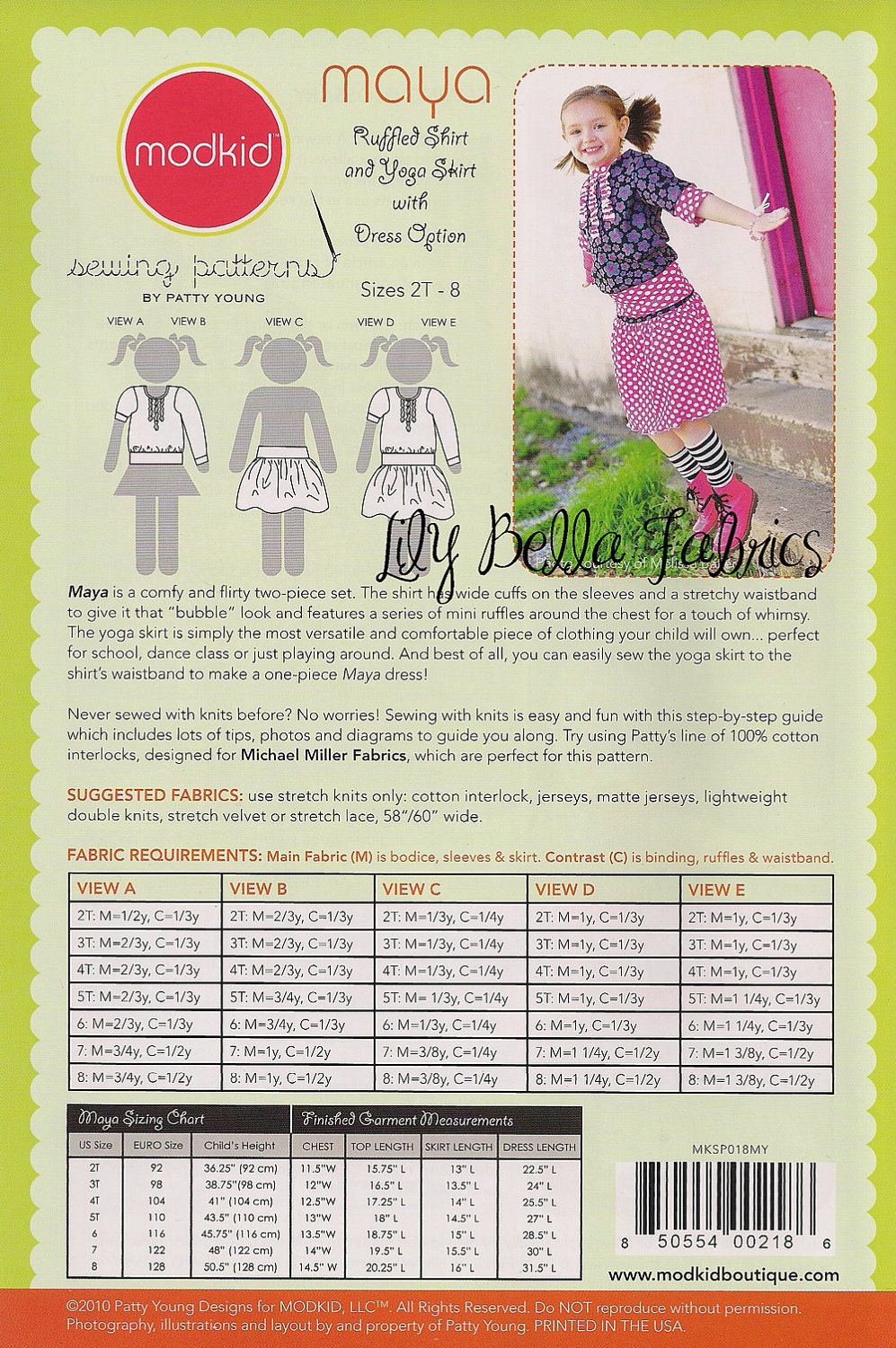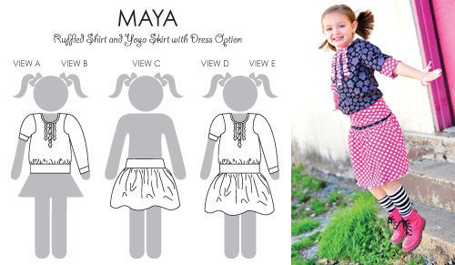 From Modkid by Patty Young: the Maya Ruffled Shirt and Yoga Skirt with Dress Option Sewing Pattern. Girls sizes 2T - 8.