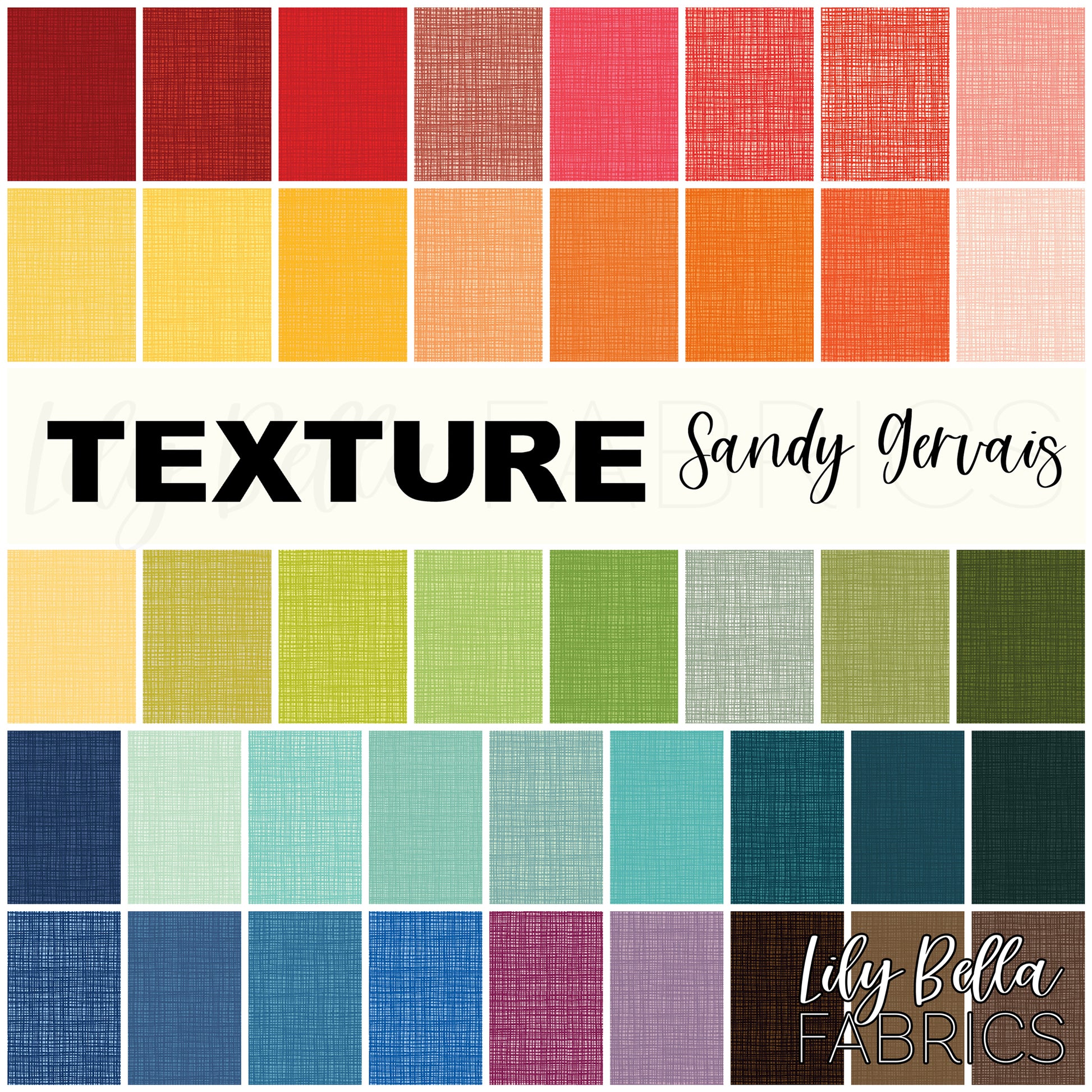 This 10 inch charm pack (layer cake) includes 42 pieces (42 prints) from the Texture collection by Sandy Gervais for Riley Blake Designs.