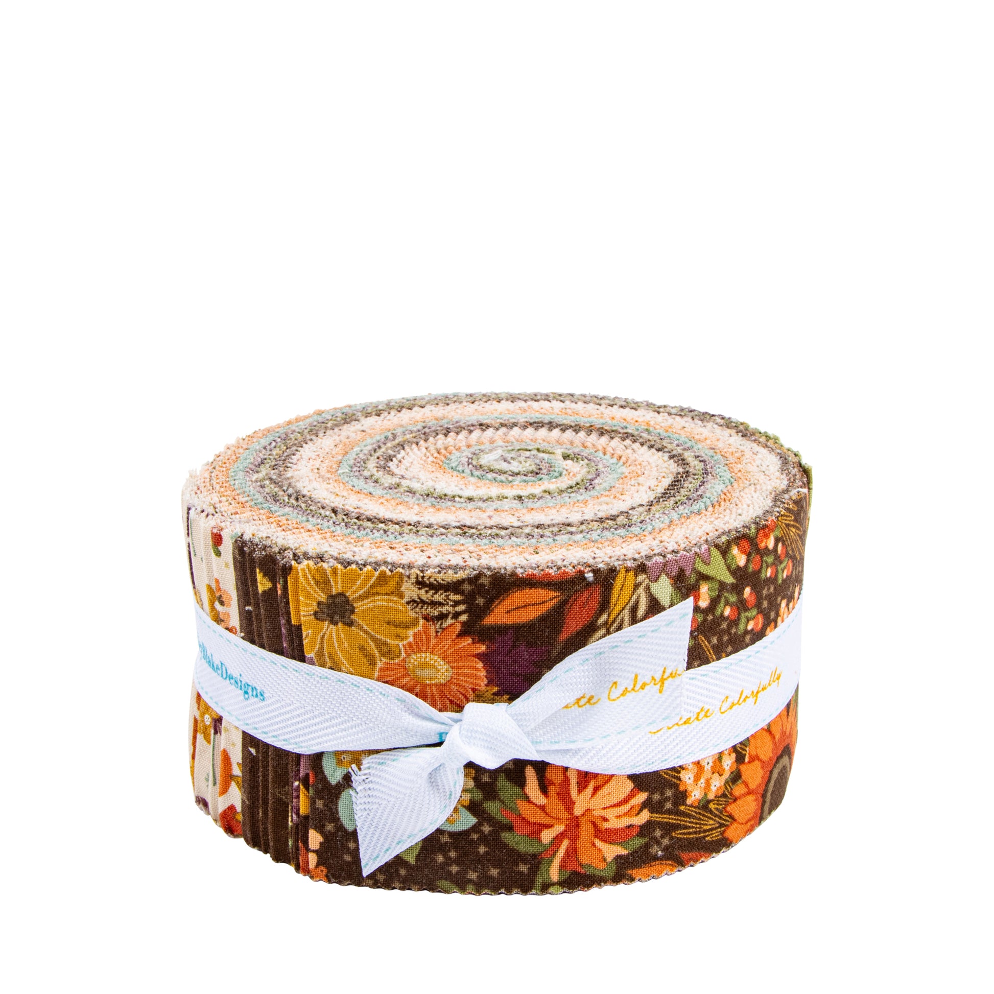 This 2.5 inch rolie polie (jelly roll) includes 40 pieces (26 prints) from The Awe of Autumn collection by Sandy Gervais for Riley Blake Designs.